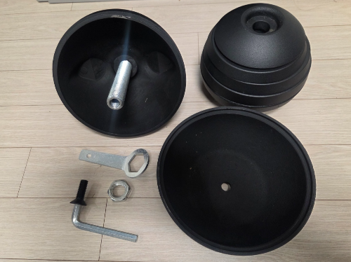 케틀벨 아래쪽의 나사를 풀면 케틀벨 본체가 분리되고, 내부의 무게추를 넣고 빼며 무게를 조절하는 방식이다.